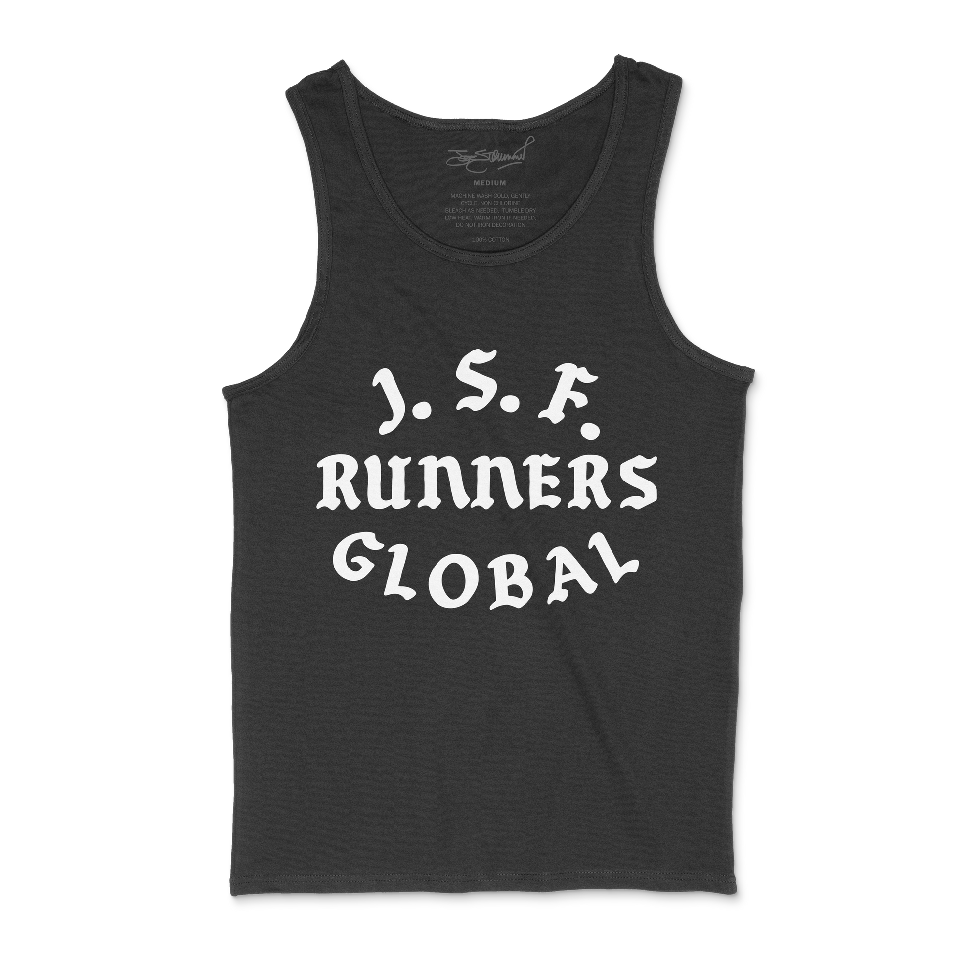 Screenprinted J.S.F. Runners Global design on a soft 100% cotton unisex tank top.